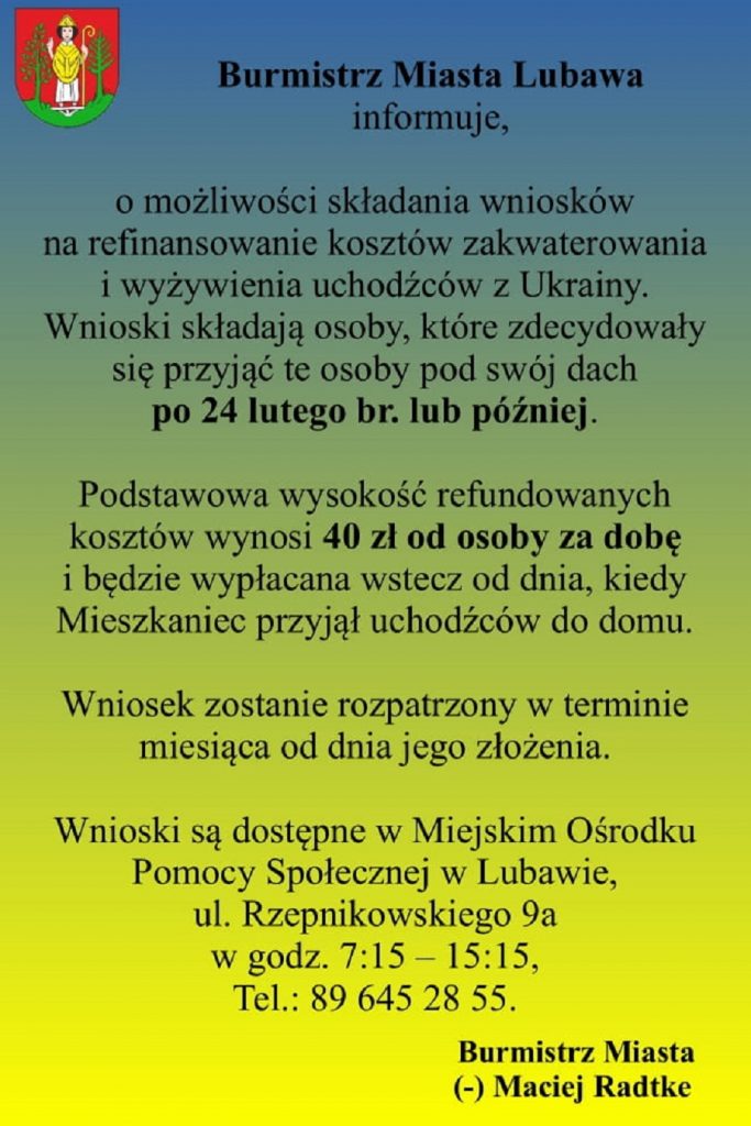 Burmistrz Miasta Lubawa informuje o możliwości składania wniosków na refinansowanie kosztów zakwaterowania i wyżywienia uchodźców z Ukrainy
