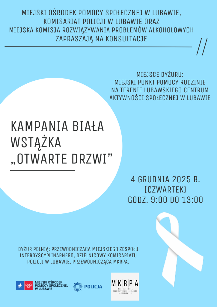 Burmistrz Miasta Lubawa, Kierownik Miejskiego Ośrodka Pomocy Społecznej w Lubawie, Komendant Komisariatu Policji w Lubawie i Miejska Komisja Rozwiązywania Problemów Alkoholowych w Lubawie po raz kolejny włączyli się do akcji „Otwartych Drzwi” w ramach Kampanii „Białej Wstążki”.
